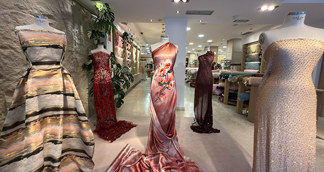 Telas bordadas en pedrería, rasos, sedas naturales estampadas, gasas y organzas… Pasearse por los estantes y los montones de rollos de tela es todo un espectáculo.